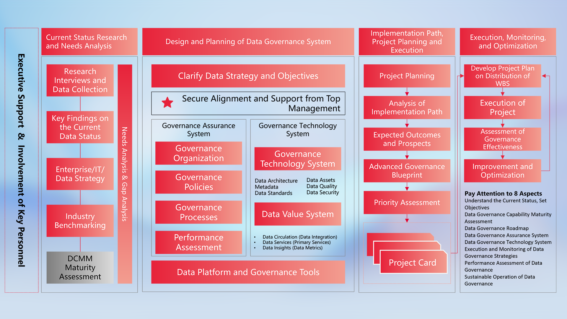 Customize solutions from a high-level professional perspective, combined with industry best practices, covering the entire life cycle of data management, ensuring the implementation of strategies, and helping enterprises build an efficient and sustainable data management system to promote digital transformation of business.